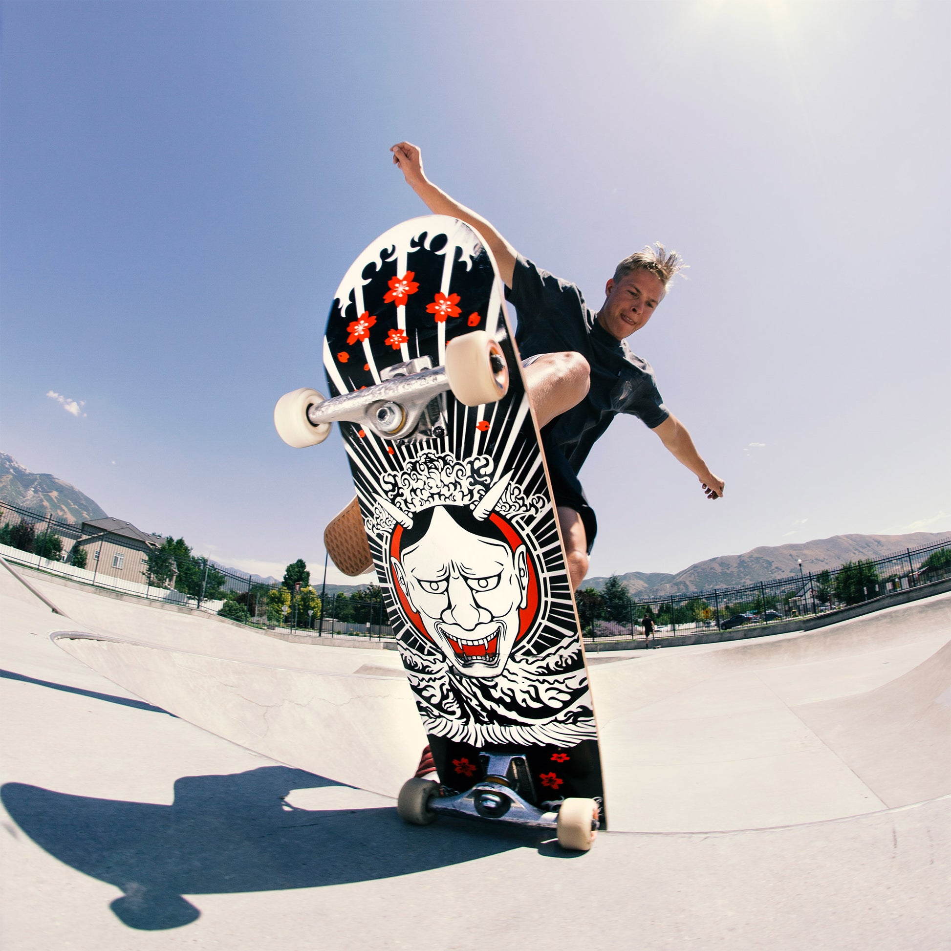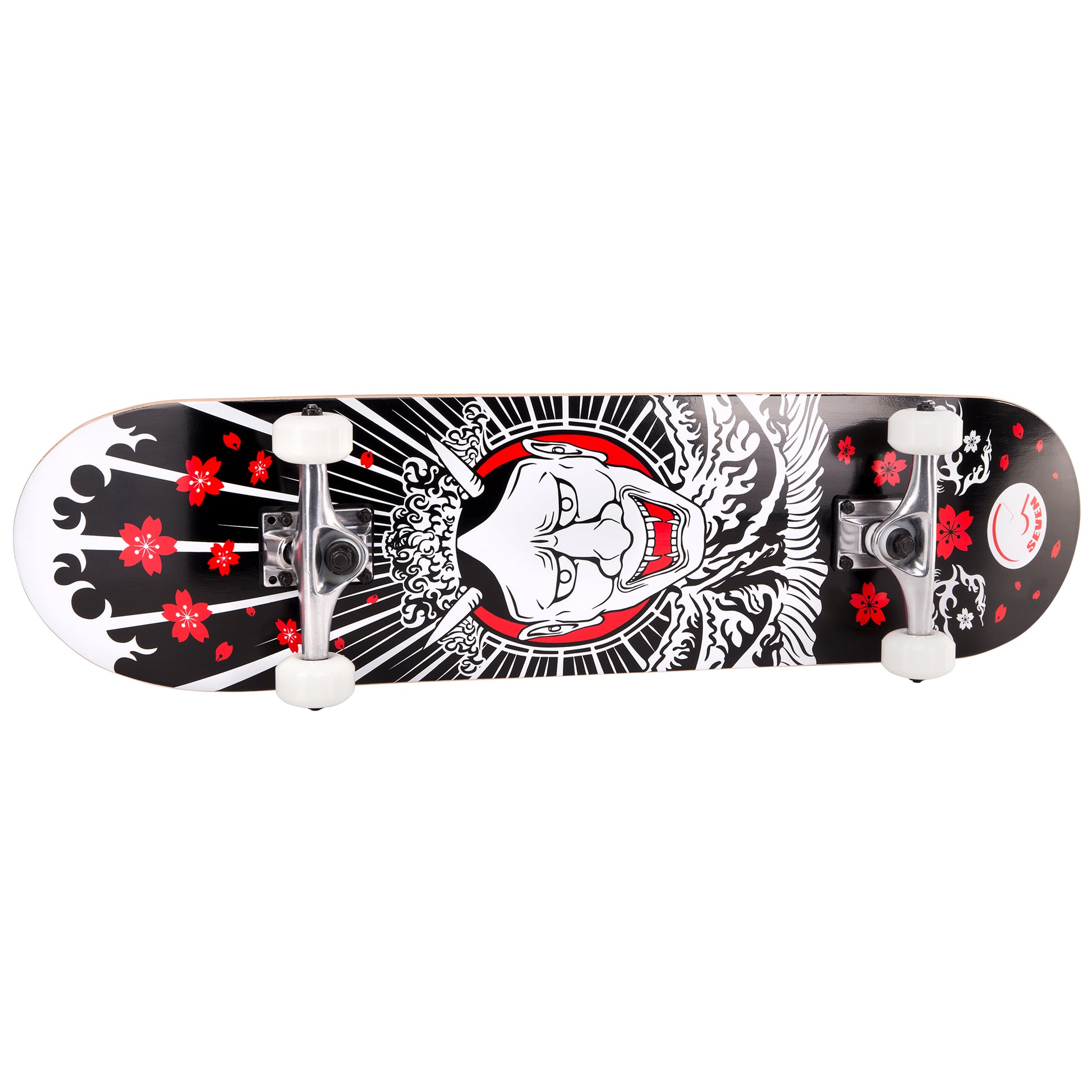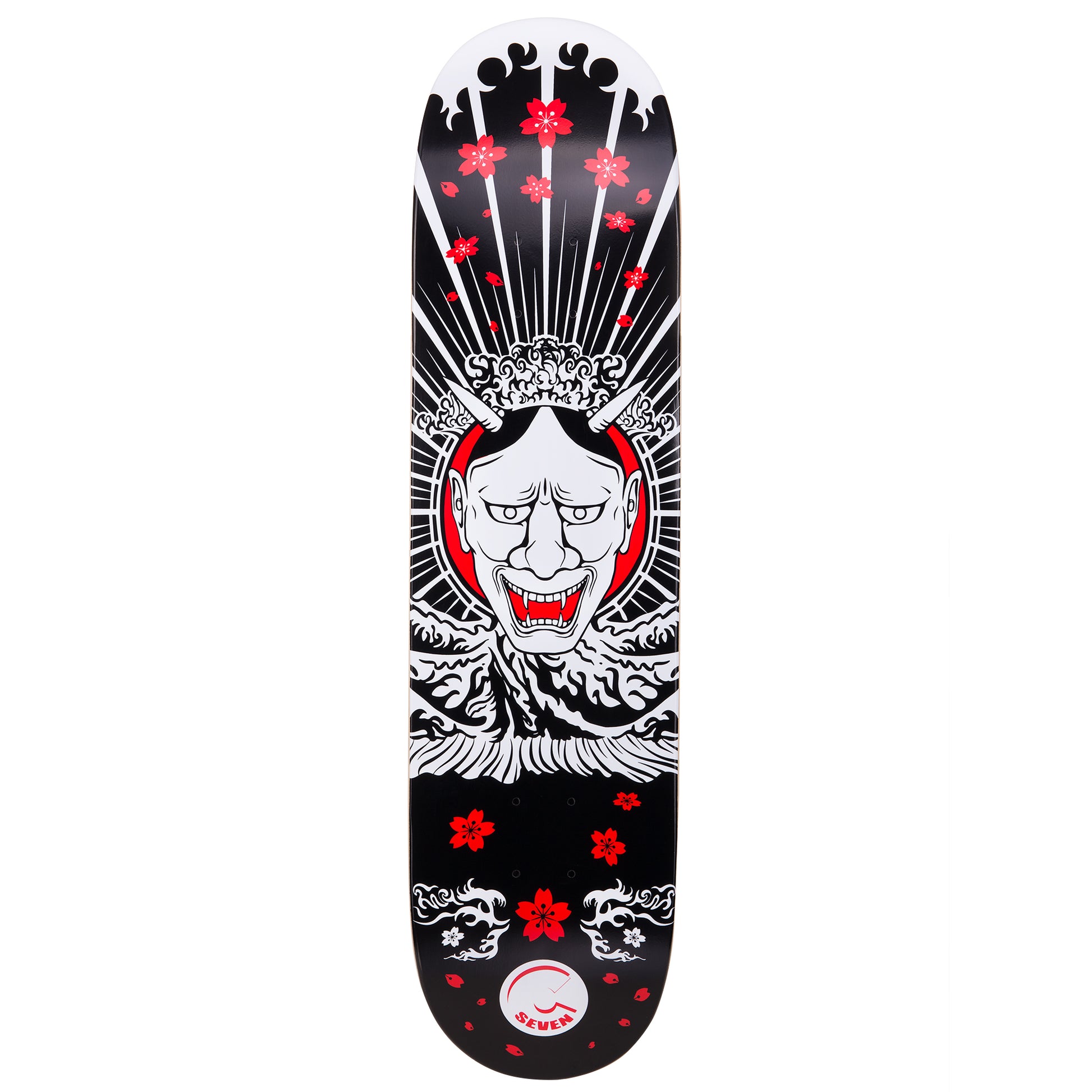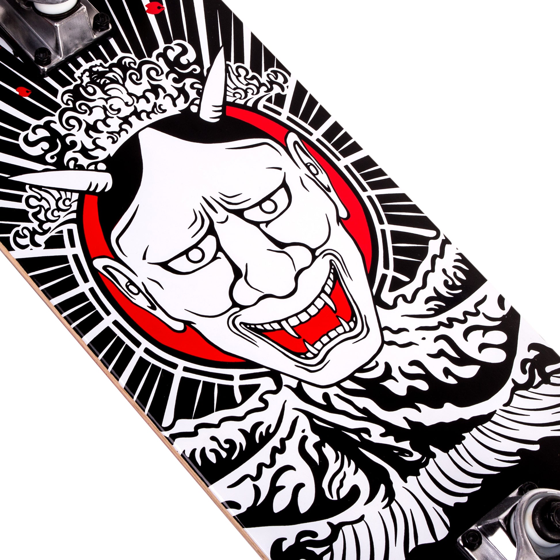 A killer graphic deck with black, red and white detail inspired by Japanese folklore. A full setup with a sturdy maple deck, 5.25 inch trucks, ABEC 7 bearings and 52mm wheels. Guaranteed against manufacturer defects for one year from purchase date.