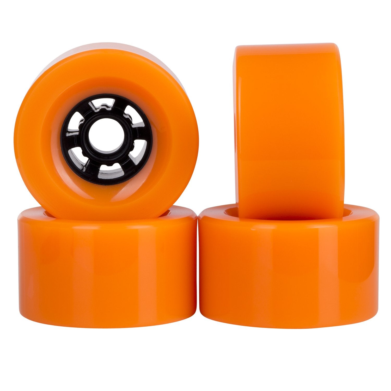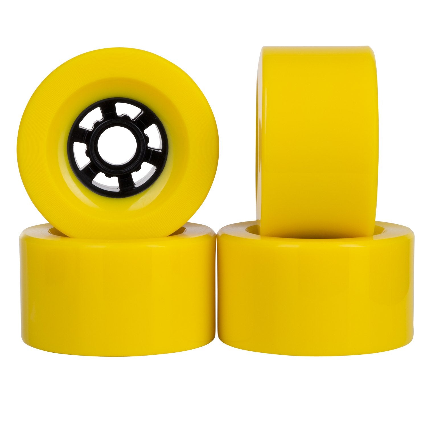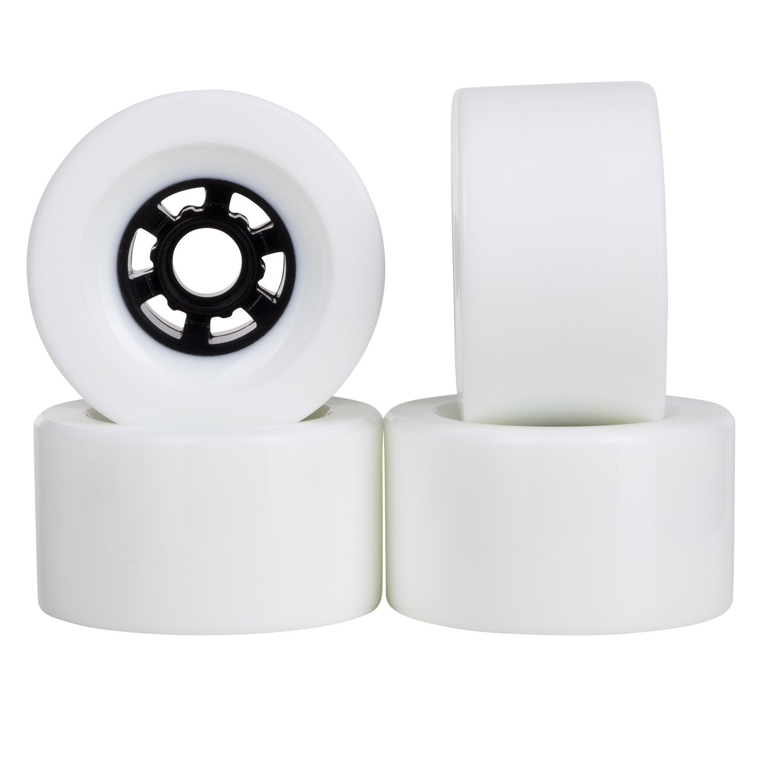 90x52mm wheels feature center set, 44.45mm hubs constructed of sturdy, impact-resistant plastic. Hub is wrapped in durable polyurethane to a depth of 19.05mm. Durometer rating of 78A, combined with the wheel’s extra width, makes for a steady, shock-absorbing ride.
