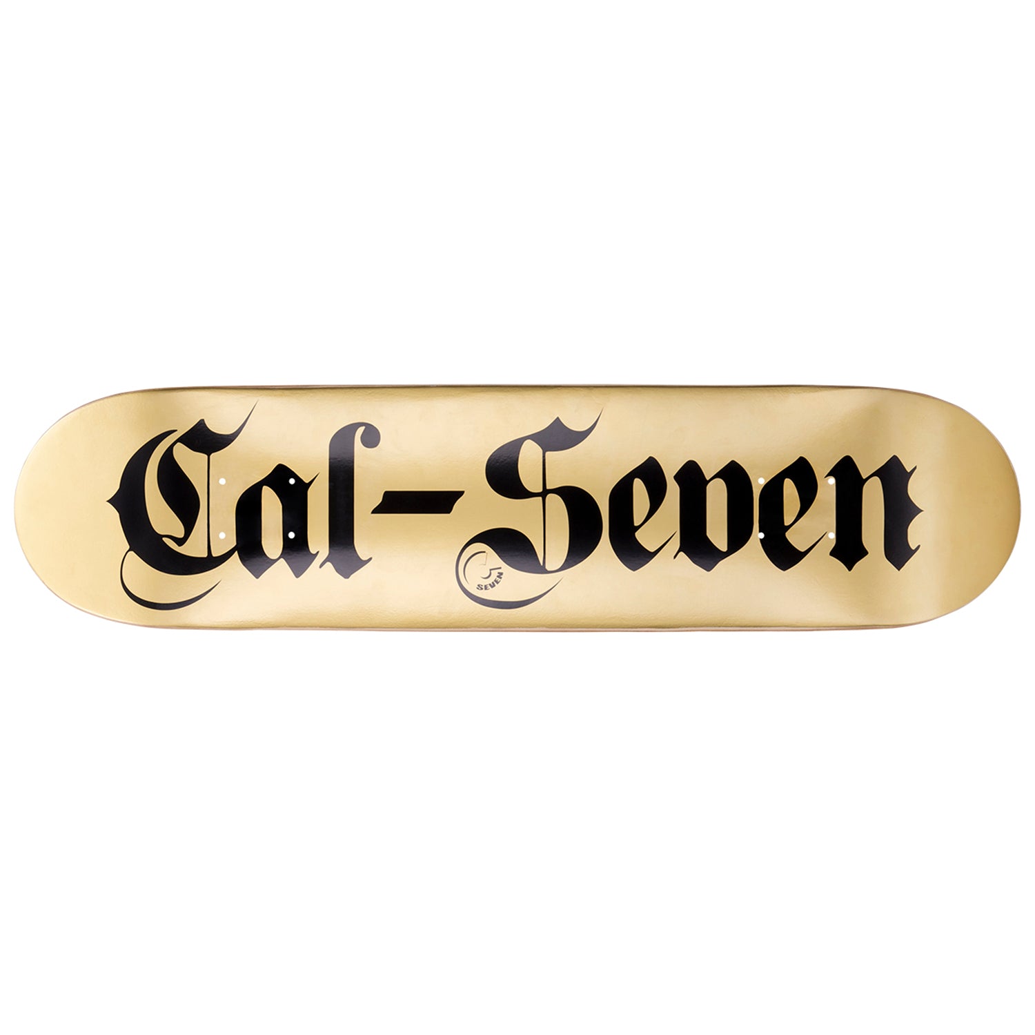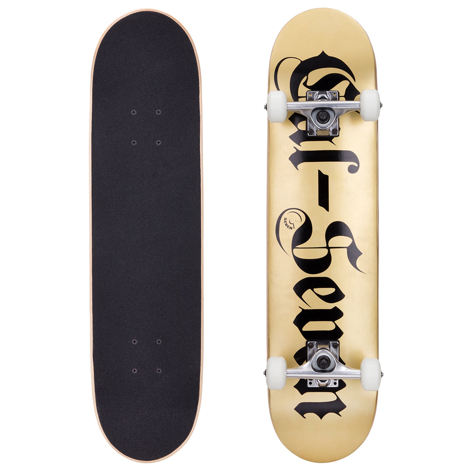 A semi-reflective gold finish with a mega Cal 7 callout in an old school popsicle shape. Set up with a 7.5 inch deck, lightweight trucks, smooth ABEC 7 bearings and 52mm PU wheels. Guaranteed against manufacturing defects for one year.